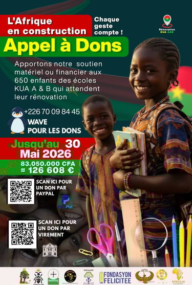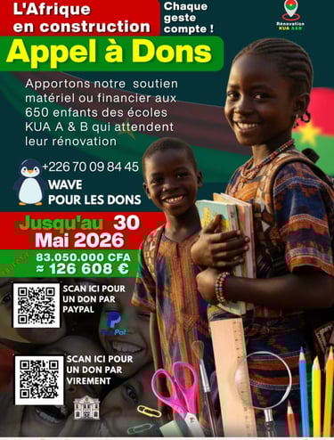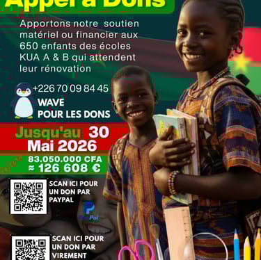 Au coeur de Seguisso se trouve un engagement concret : la rénovation complète du groupe scolaire Kua A & B à Bobo-Dioulasso. Ensemble, offrons aux enfants un cadre d'apprentissage digne.